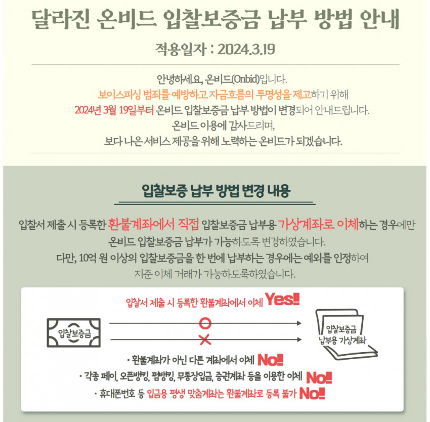 온비드 입찰보증금 납부가 가능하도록 2024년 3월 19일부터 변경되어 시행하고 있습니다.