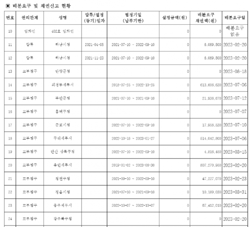 신탁재산에는 당해세(재산세와 종합부동산세)만 청구가 되는것으로 알고 있는데, 아래의 물건은 압류설정되지 않은 수십개의 지자체에서 배분요구를 하였습니다. 이부분이 이해가 되지 않습니다.