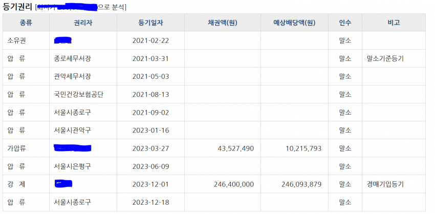 3. 21년 3월 31일 압류(최선순위 설정) 설정 이후 많은 압류들이 등기가 된 물건의 경우